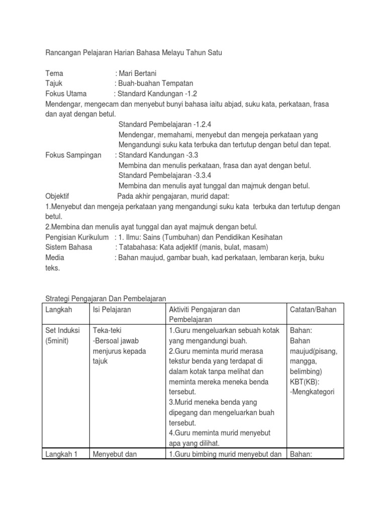 Rancangan Pelajaran Harian Bahasa Melayu Tahun Satu Buah Buahan Pdf